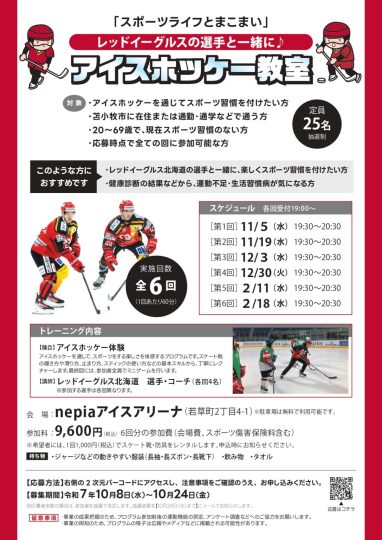 このたび、レッドイーグルス北海道は、苫小牧市と連携したスポーツ習慣化プログラム「スポーツライフとまこまい・アイスホッケー教室」を実施することとなり、10月8日(水)より参加者を募集いたします。
