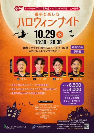 このたび、レッドイーグルス北海道では、10月29日(水)にグランドホテルニュー王子とのコラボレーションイベント「選手と楽しむ ハロウィンナイト」を、グランドホテルニュー王子16階スカイレストラングランビューにて開催いたします。