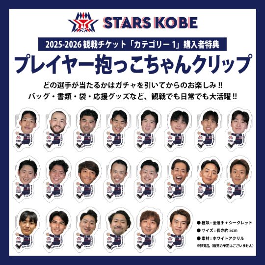 本特典は、2025-2026シーズンのすべてのホームゲームにおける「カテゴリー1」の観戦チケットをお持ちの方に限り、会場入場時にガチャ形式でお渡しします。