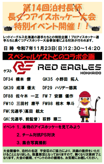 レッドイーグルス北海道公式サイト:11/23「第14回泊村長杯長ぐつアイスホッケー大会」選手参加のお知らせ