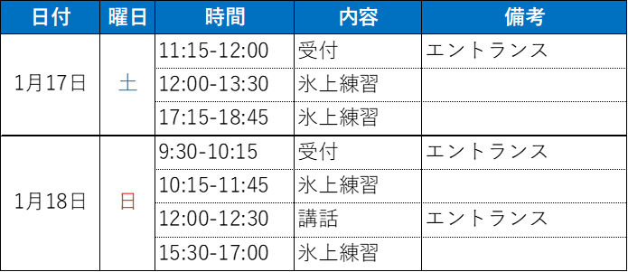 ※氷上練習1日2回(全4回)・講話1回