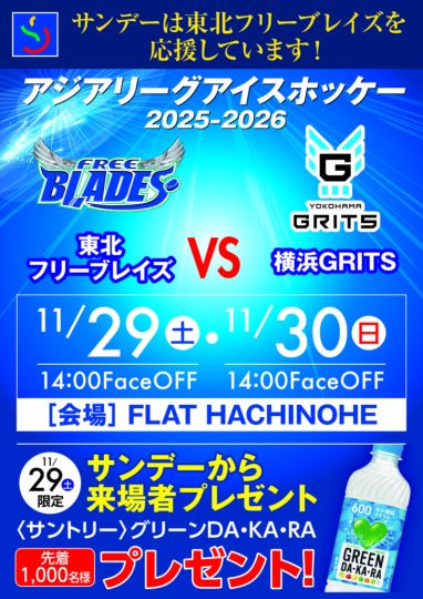 東北フリーブレイズユニフォームサポーターの株式会社サンデー様より、11月29日(土)横浜GRITS戦におきまして、来場者先着1000名様にサントリーグリーンDA・KA・RAをご提供いただきます!