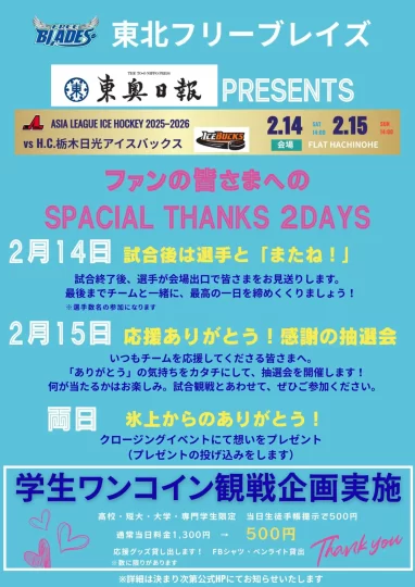 東北フリーブレイズ公式サイト:2/14,15 ホームゲームイベント情報