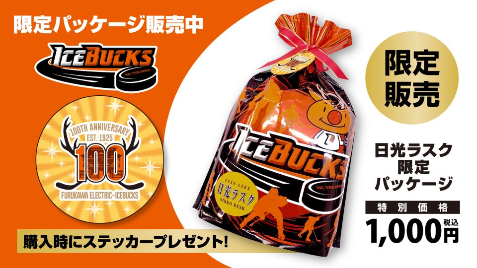 ・ブース1F東側にて日光ラスク特別パッケージ 100周年タグとプレーオフステッカー付き販売!